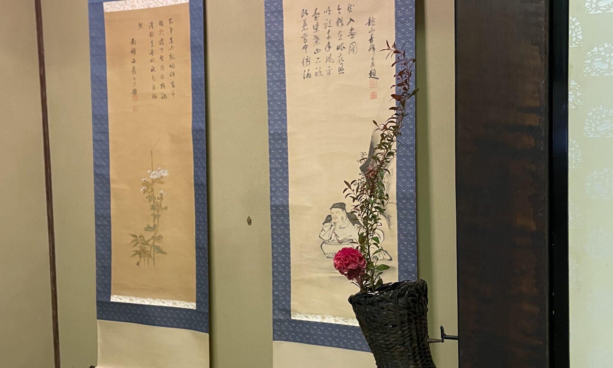 中国南北朝時代の詩人、「陶淵明」が酒の壺を抱えて何ものかを眺めている絵と菊の絵の対幅です。今年は、閏月があり旧暦9月9日は新暦では10月の末になるとのこと。それなら菊の絵でも間に合います。菊は他人と争わず、凛とした花。「陶淵明」も菊に例えられえる人物です。「これで掛け物は決まり」と安心していたところ、「いや待てよ」と茶室の間取りを調べてみたところ、広いとの印象だった床の間は一間床でした。