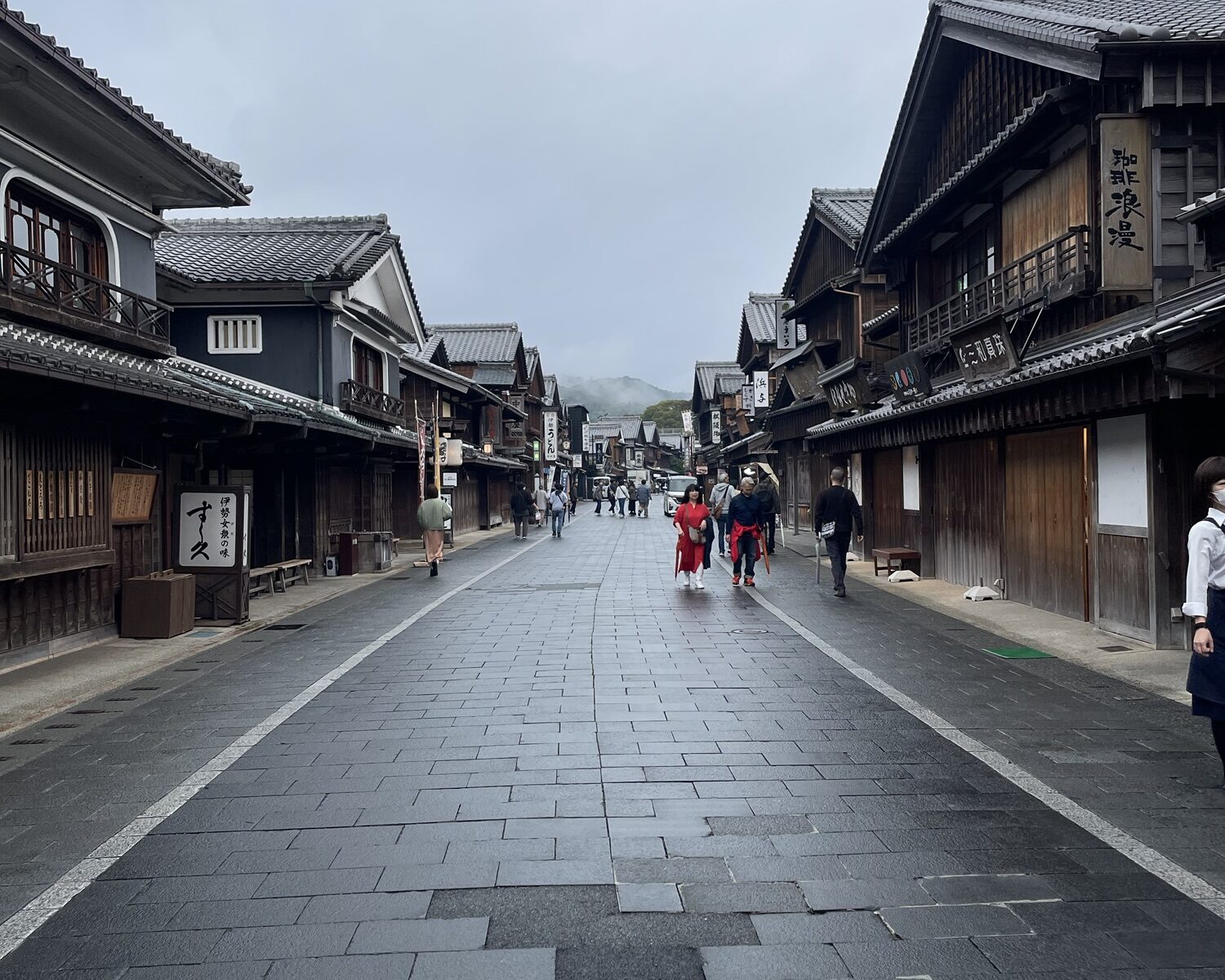 翌日は、9時に宇治橋に集合。まだ開店前のおかげ横丁は人影もまばら。昼間の喧騒が嘘のようです。9時20分頃、家元到着。神職に導かれて内宮内の神殿を巡り、最後は垣内で参拝。10時半からは神楽殿にて家元献茶式。