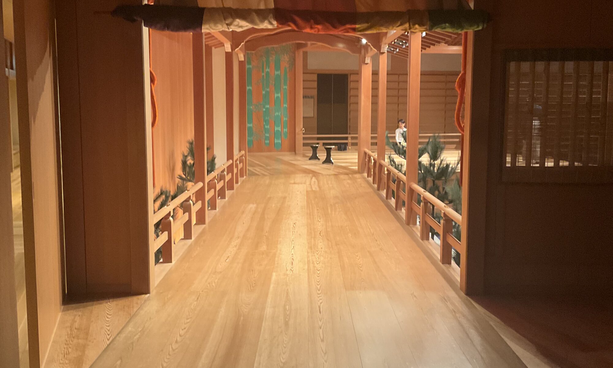 【画像は、観世能楽堂鏡の間から見た橋掛】