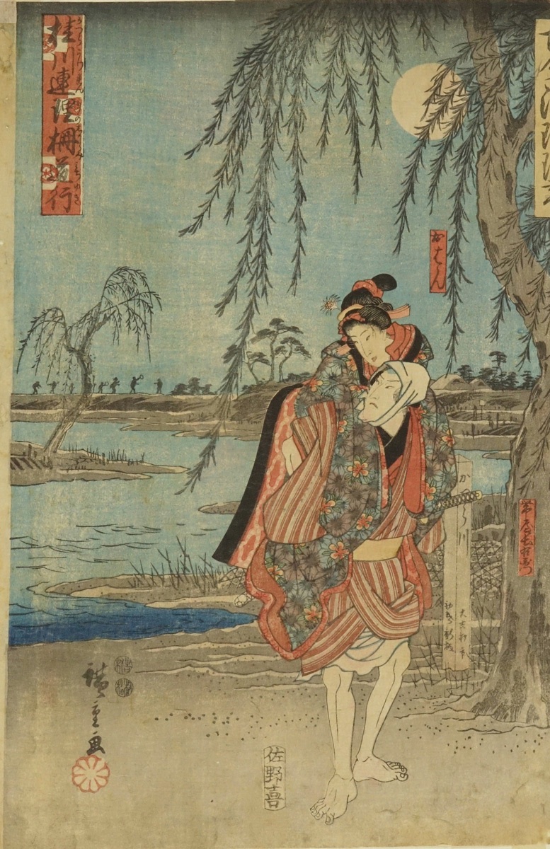 小唄を嗜んだ方であれば、ほとんどの方が初心者の頃に稽古なさったと思います。小唄でも一、二を争うポピュラーな楽曲です。この曲は、浄瑠璃の『桂川連理柵』を題材にしています。長右衛門とは、京都の呉服店帯屋の主人、45歳。お半は、隣家信濃屋の娘13歳。この二人が、お伊勢参りの帰り道、石部(琵琶湖の南、東海道の石部宿)で偶然会ったことからただならぬ仲となり、お半は身籠ることになります。とても世間が容認できる仲ではありません。二人は悩んだあげく、帯祝いの日(妊娠5ヶ月に岩田帯を締めるお祝い)に桂川で入水心中を図るという悲恋の物語です。